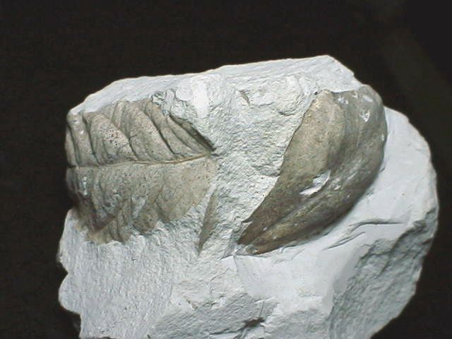 | 2種類の葉が全くでたらめな方向を向いています。 神戸層の化石は堆積のしかたが2種類あります。 一つはこの様にでたらめに入っている物。 もう一 つは層状に入っている物です。 古神戸湖の周辺で大規模な火山の噴火があり、 大量の火山灰が降り積もりました。 雨が降り落ち 葉が湖に運ばれ堆積しますが、このとき乾いたまま の状態で一気に堆積した物は、葉が丸まったまま で堆積しました。 比較的ゆっくり水の中で堆積し た物は、水分を吸って元通り広がった状態で層状に 堆積し化石になった物と想像されています。 右の葉の長さ4cm |